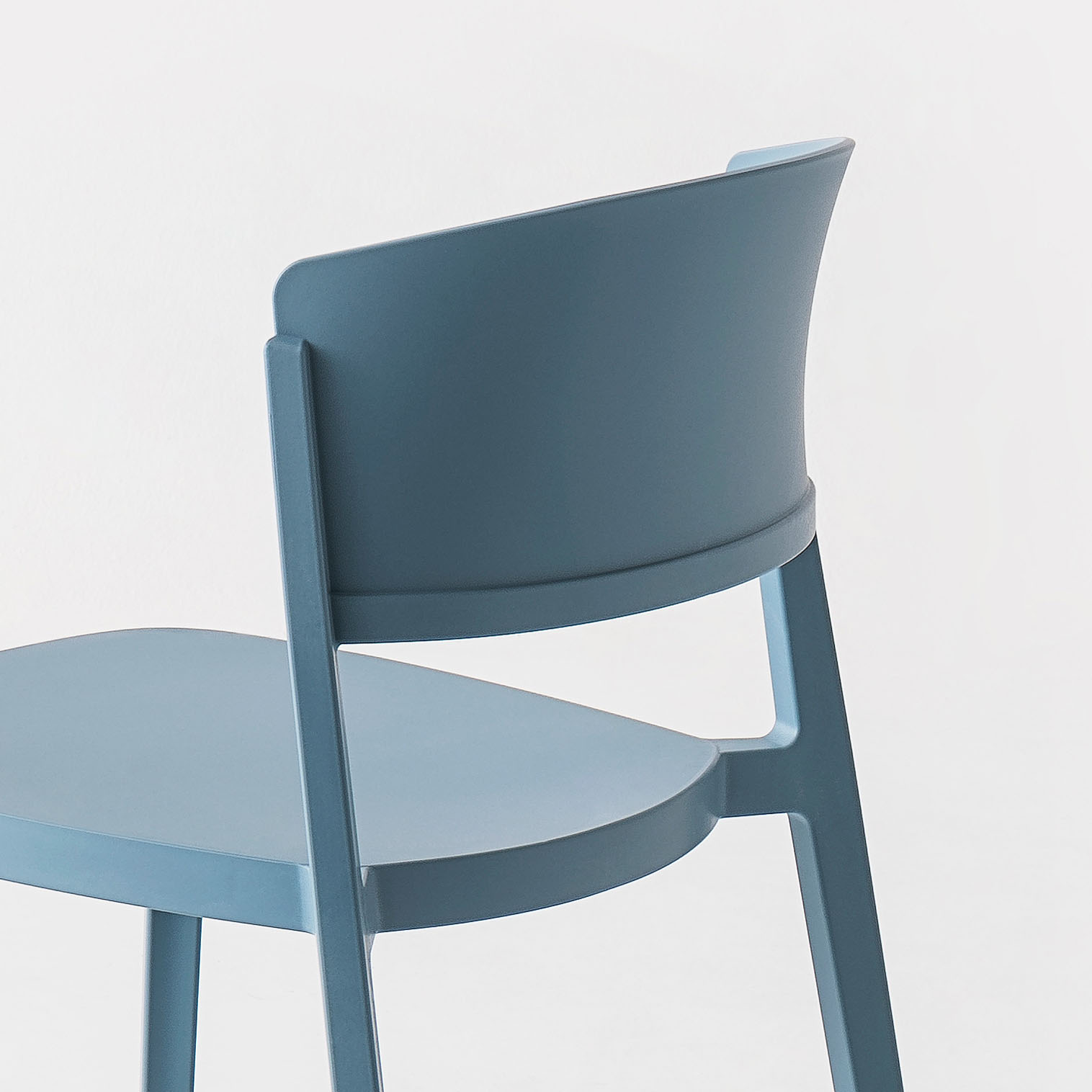 A complete range of functional and versatile chairs and barstools with softly elegant design. On the outdoor version of the Abuela collection, delicately soft injected tecnopolymer details mirror the solid wood joints of the indoor version.