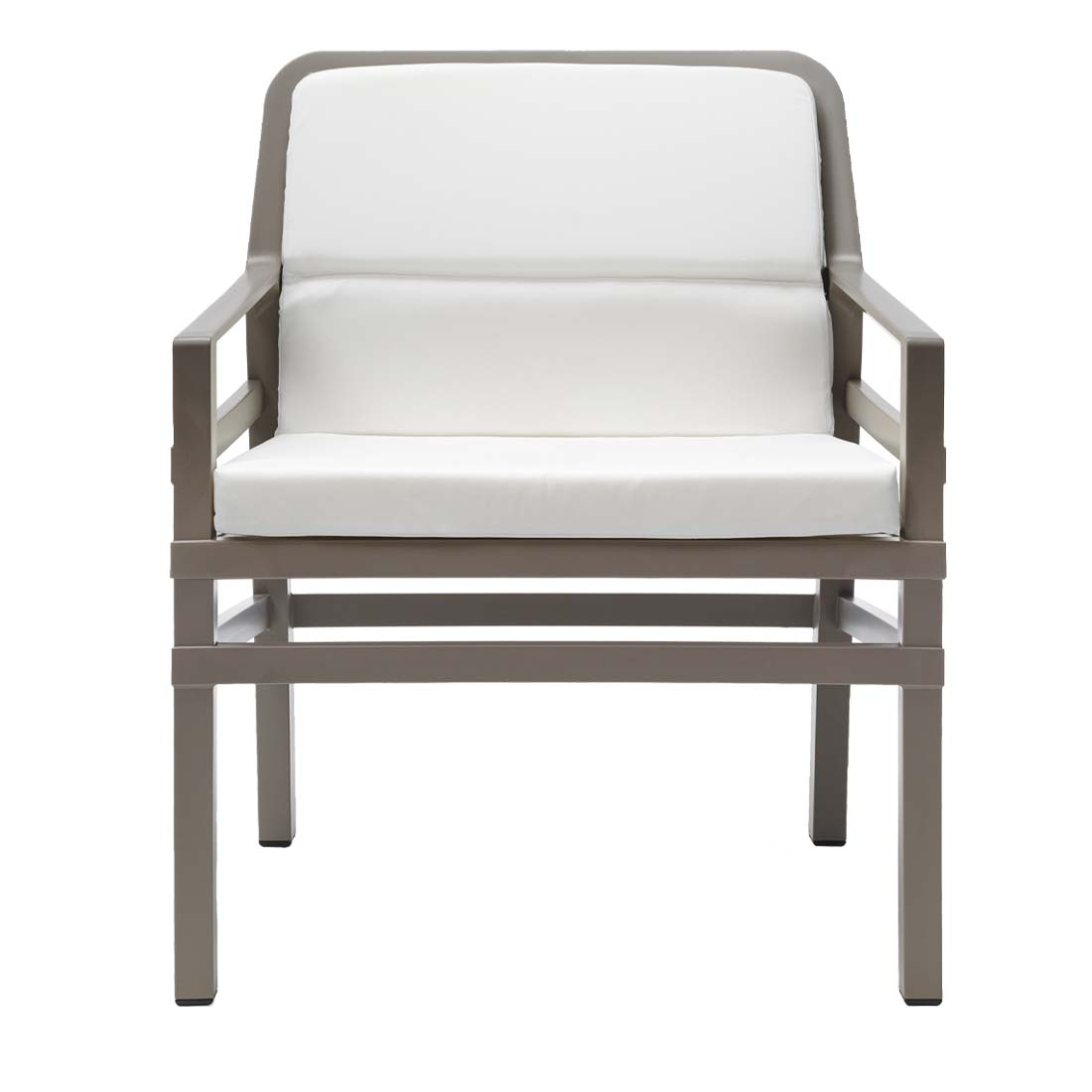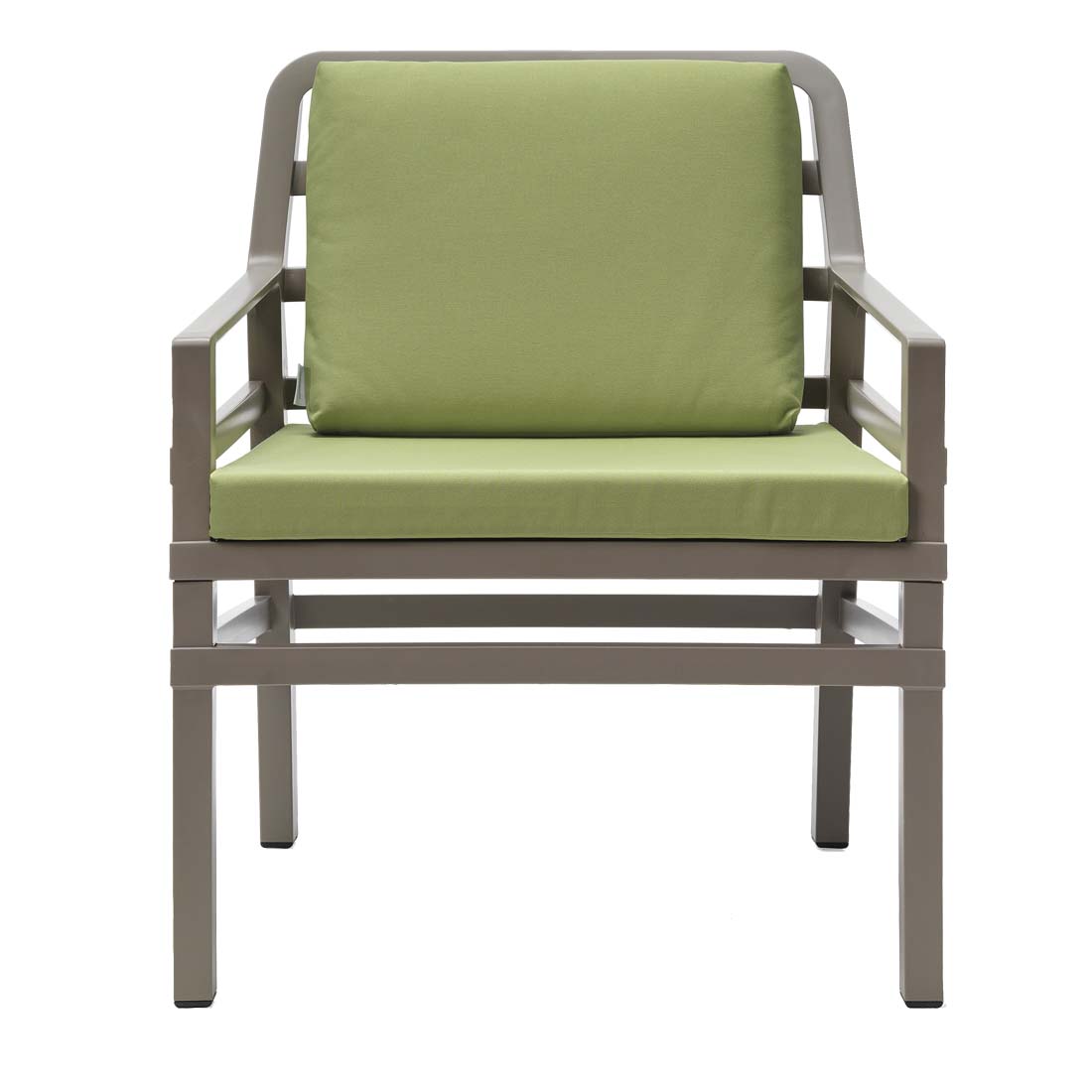 Large fibreglass resin chair with slatted structure and a matt finish similar to lacquered wood. A number of frame/cushion colour combinations available.