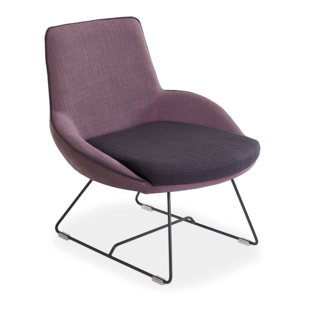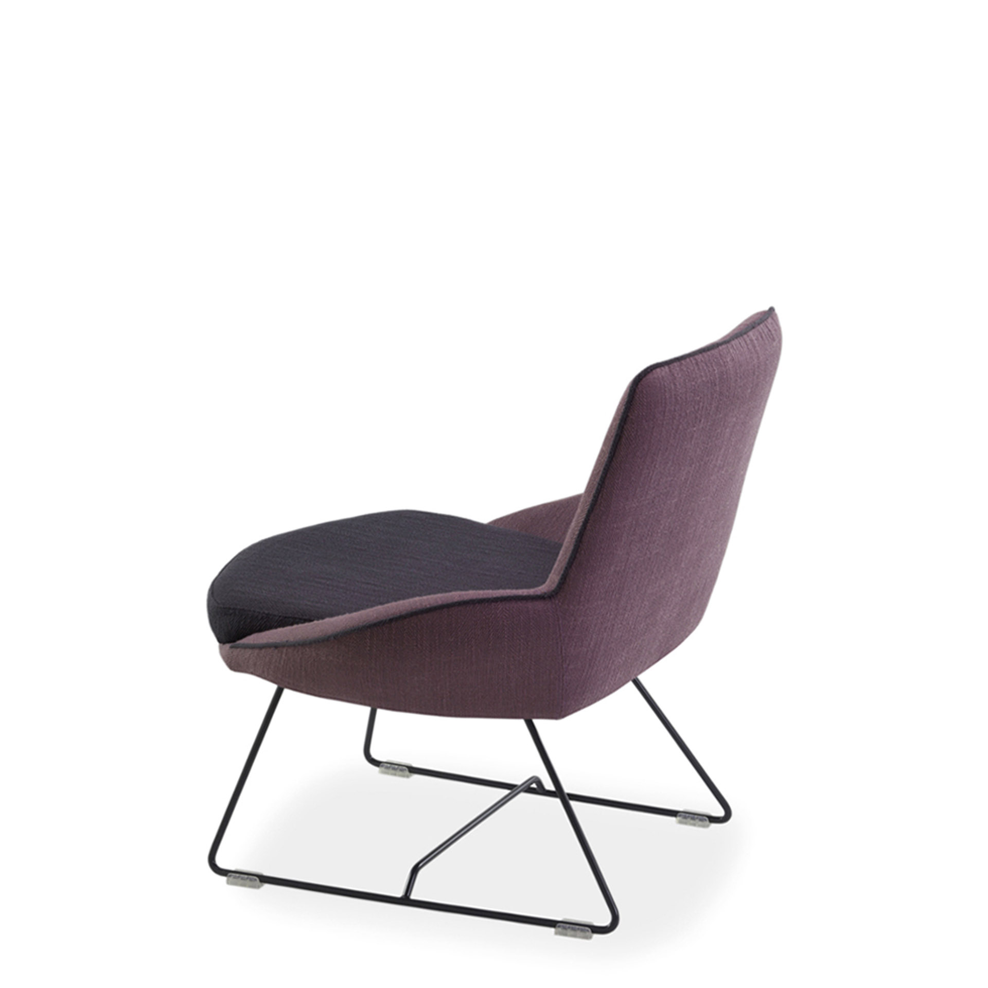 Lounge chair with metal frame, seat and back upholstered in ecoleather or in fabric, available in different colors.