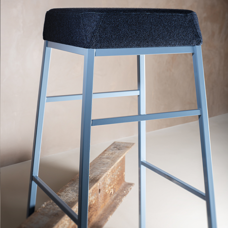 A simple, essential and functional stool. The upholstered seat with visible stitching is supported by a thin metal frame with square section uprights.