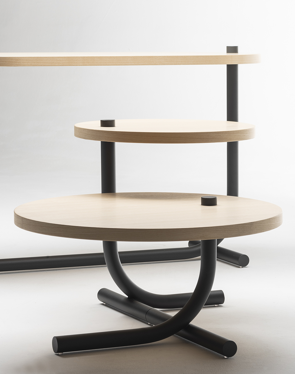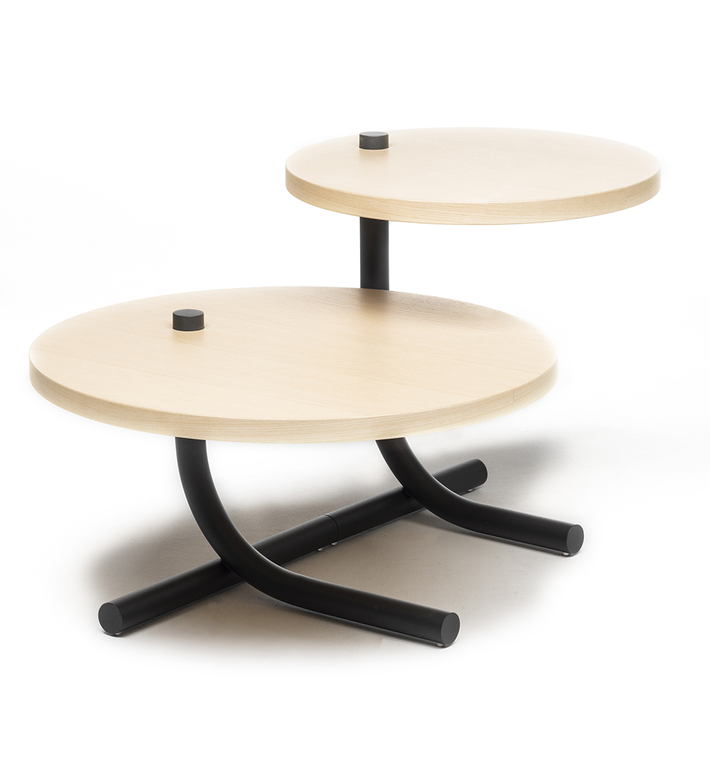 The Bubalus T-Me coffee table features an anthracite or ocean blue powder-coated steel frame with a natural or blue ocean matt lacquered ash veneered top.