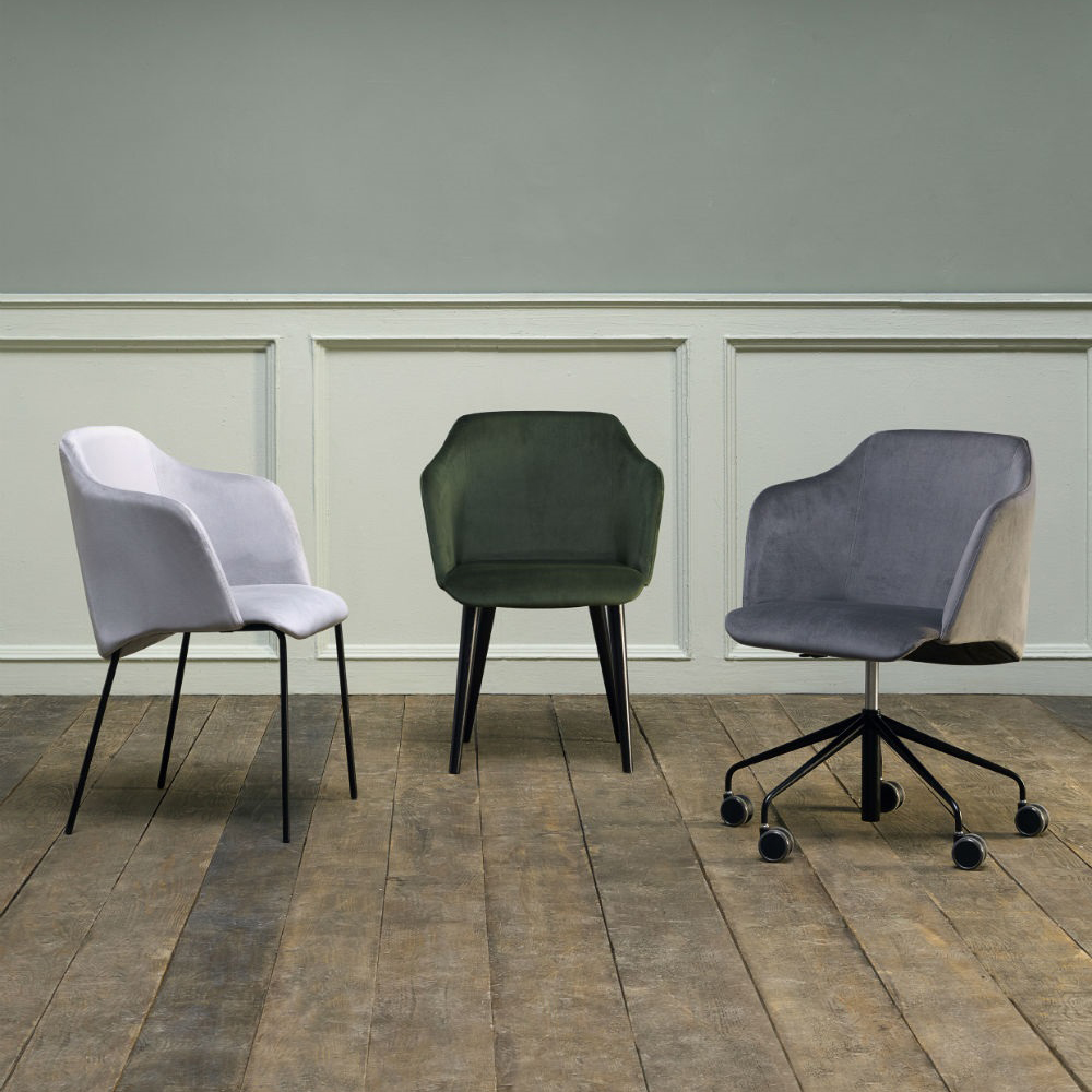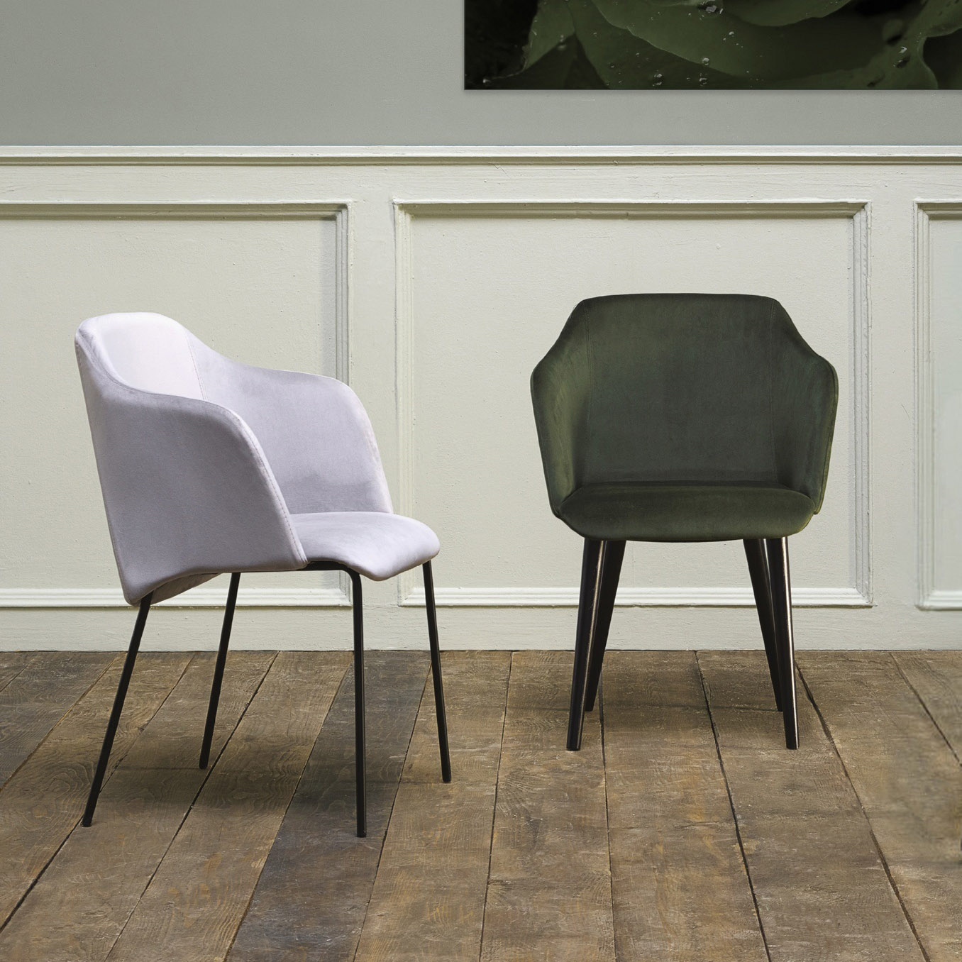 Armchair with metal frame, seat and back upholstered in fabric, available in different colours.