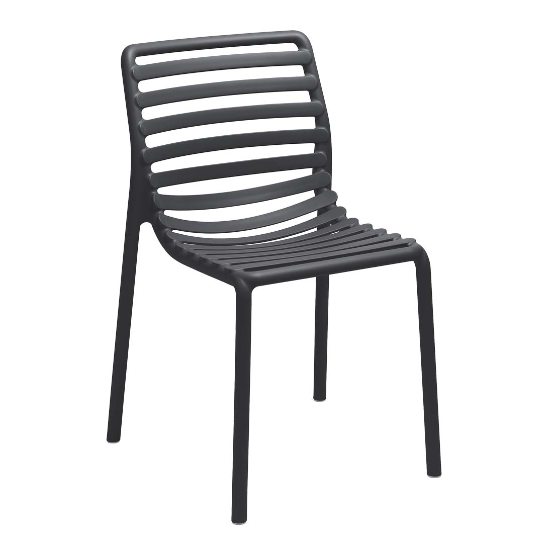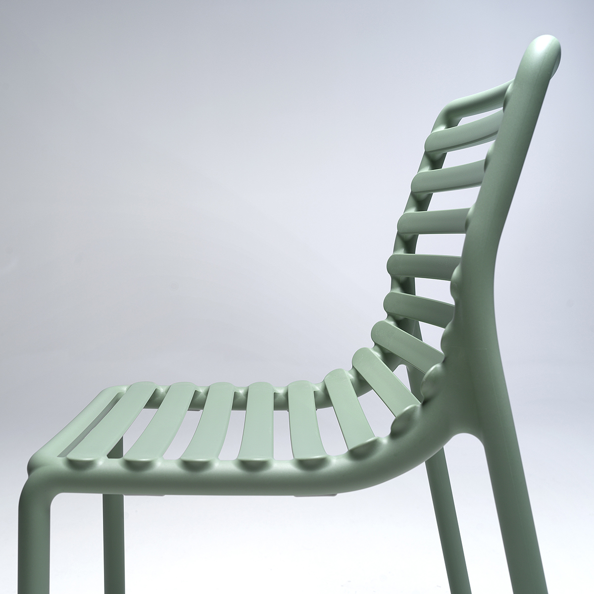 The slatted design is given a contemporary look for Doga Bistrot, an outdoor chair without armrests made of fiberglass resin. It is handy to move, stackable, easily sanitized and entirely recyclable.