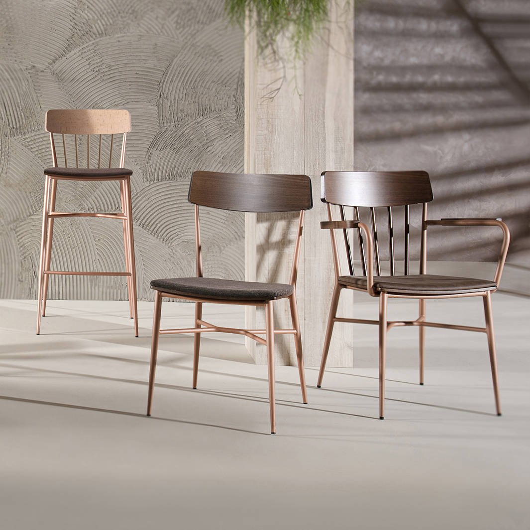 The retro style transpires from every detail of the Naika line. The sober elegance and the energetic character of this collection is expressed in a wide range of chairs, stools and armchairs, perfect for different situations and locations.