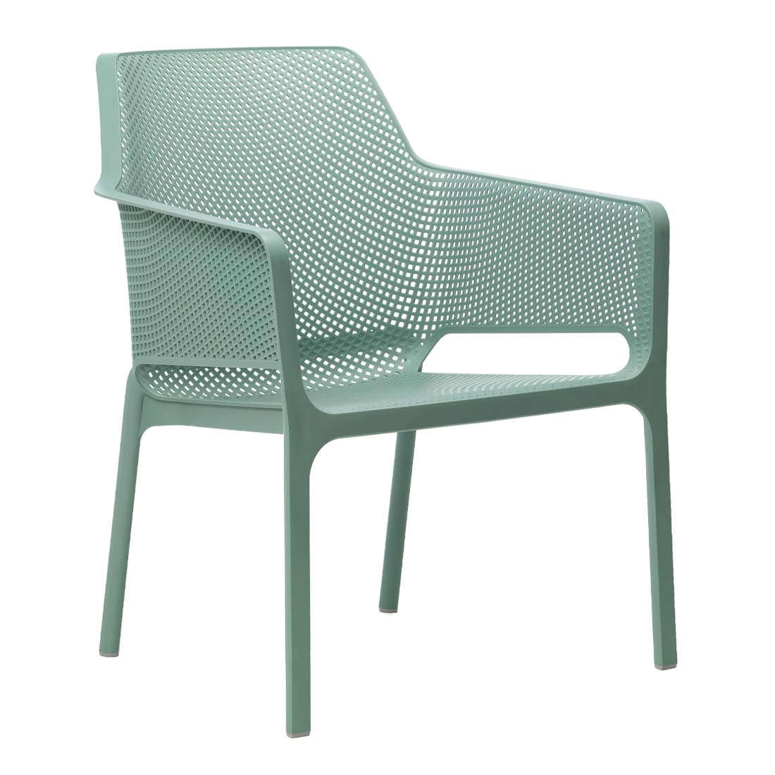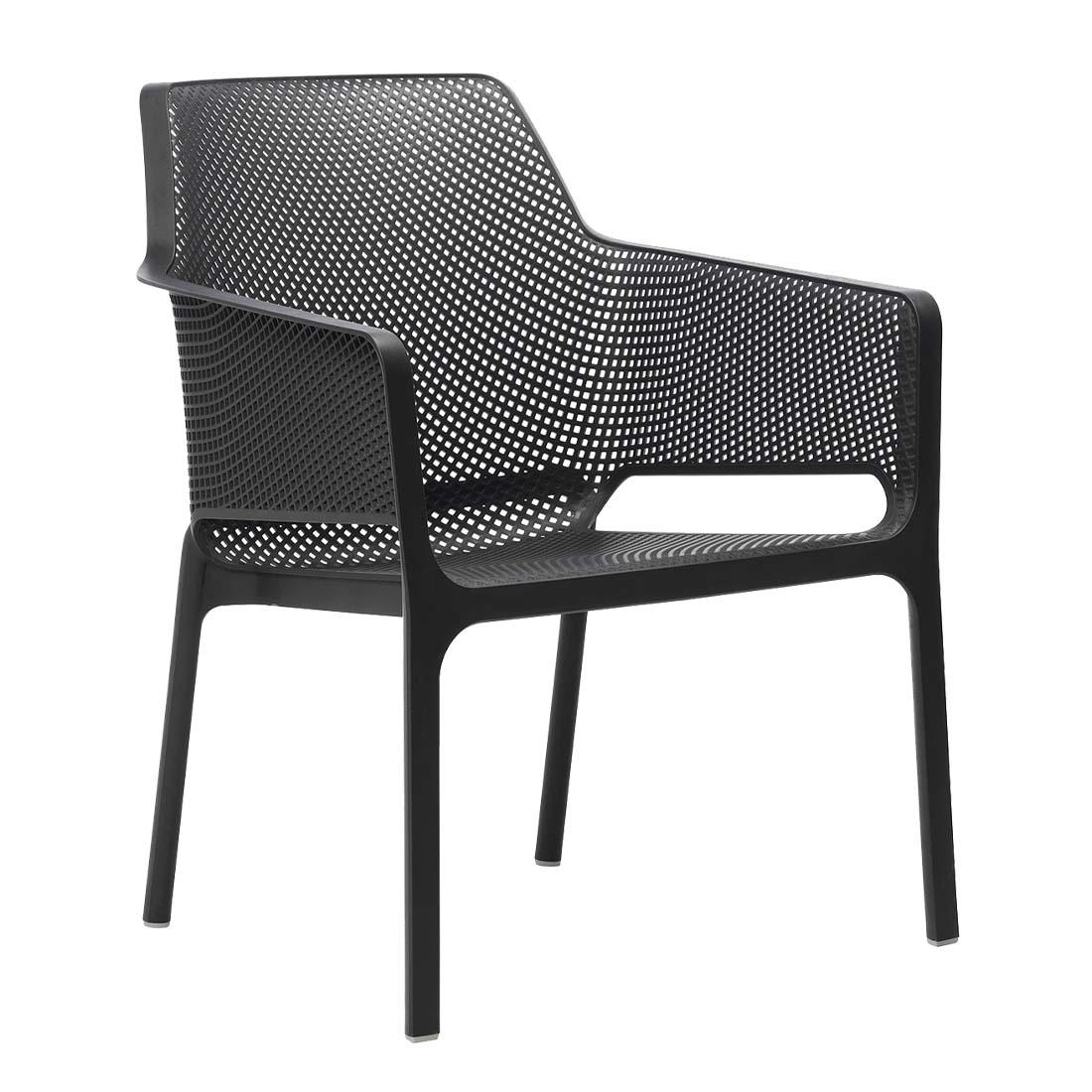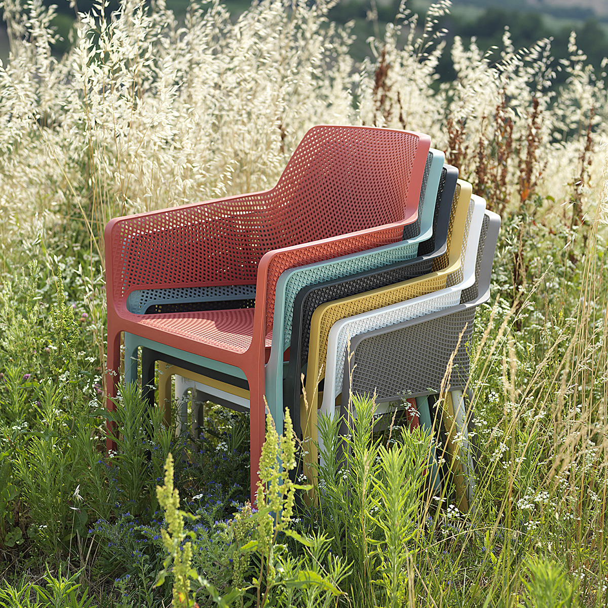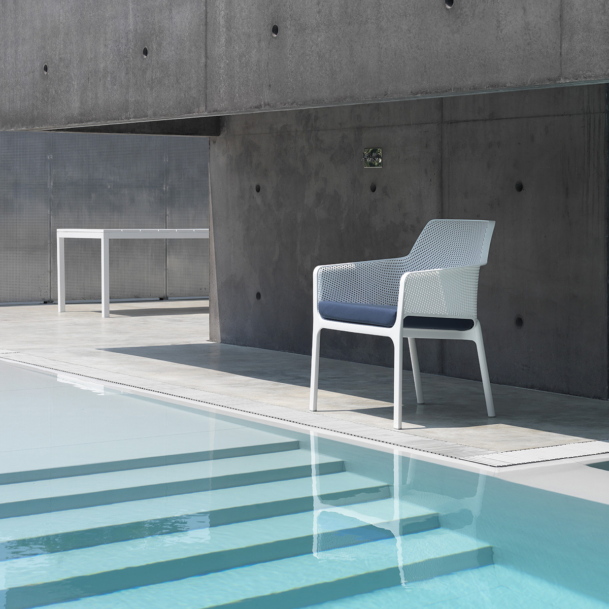 Monobloc armchair. Material: uniformly colored fiberglass polypropylene resins with UV additives. Matt finish. With non-slip feet. Cushion available to order. Recyclable resin.
