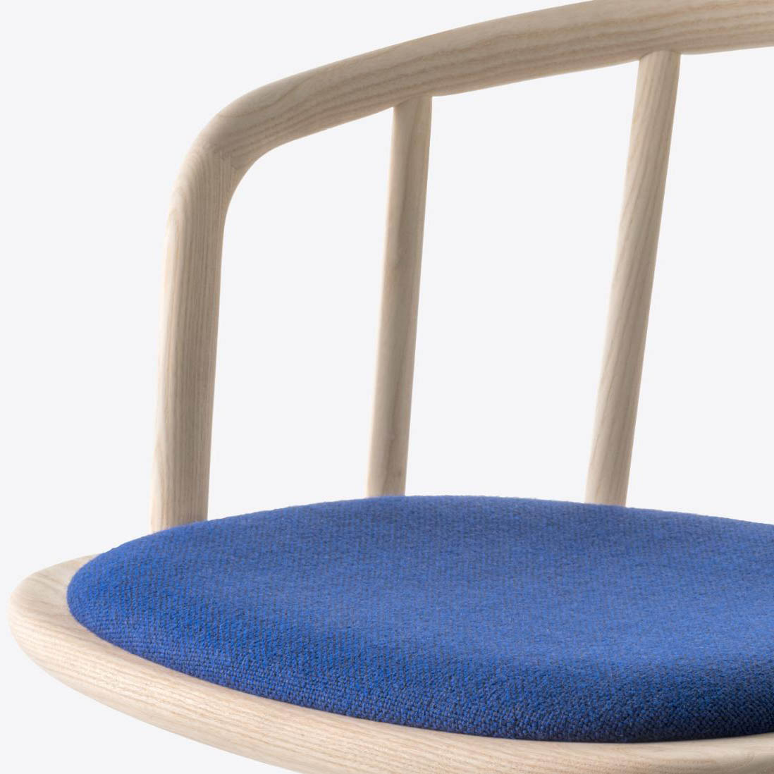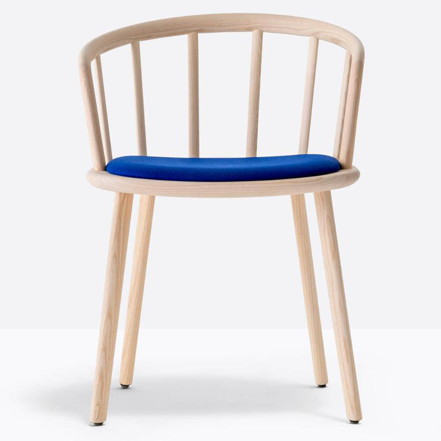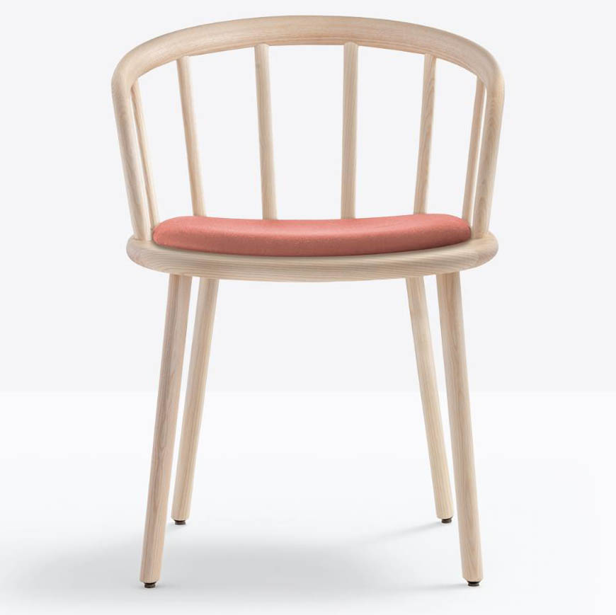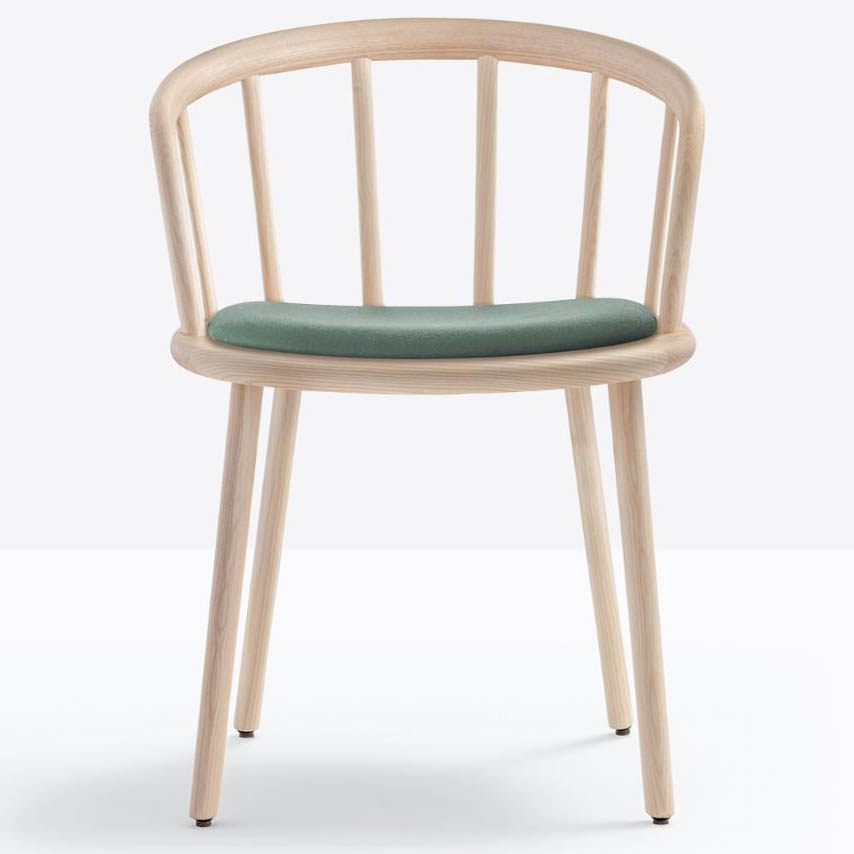 Nym is a collection made of solid ash wood which reviews Windsor chairs with a contemporary style. The backrest of the armchair designs an uninterrupted arch that perfectly joins the seat of solid ash wood with upholstered seat and turns into an armrest. Ash wood legs.