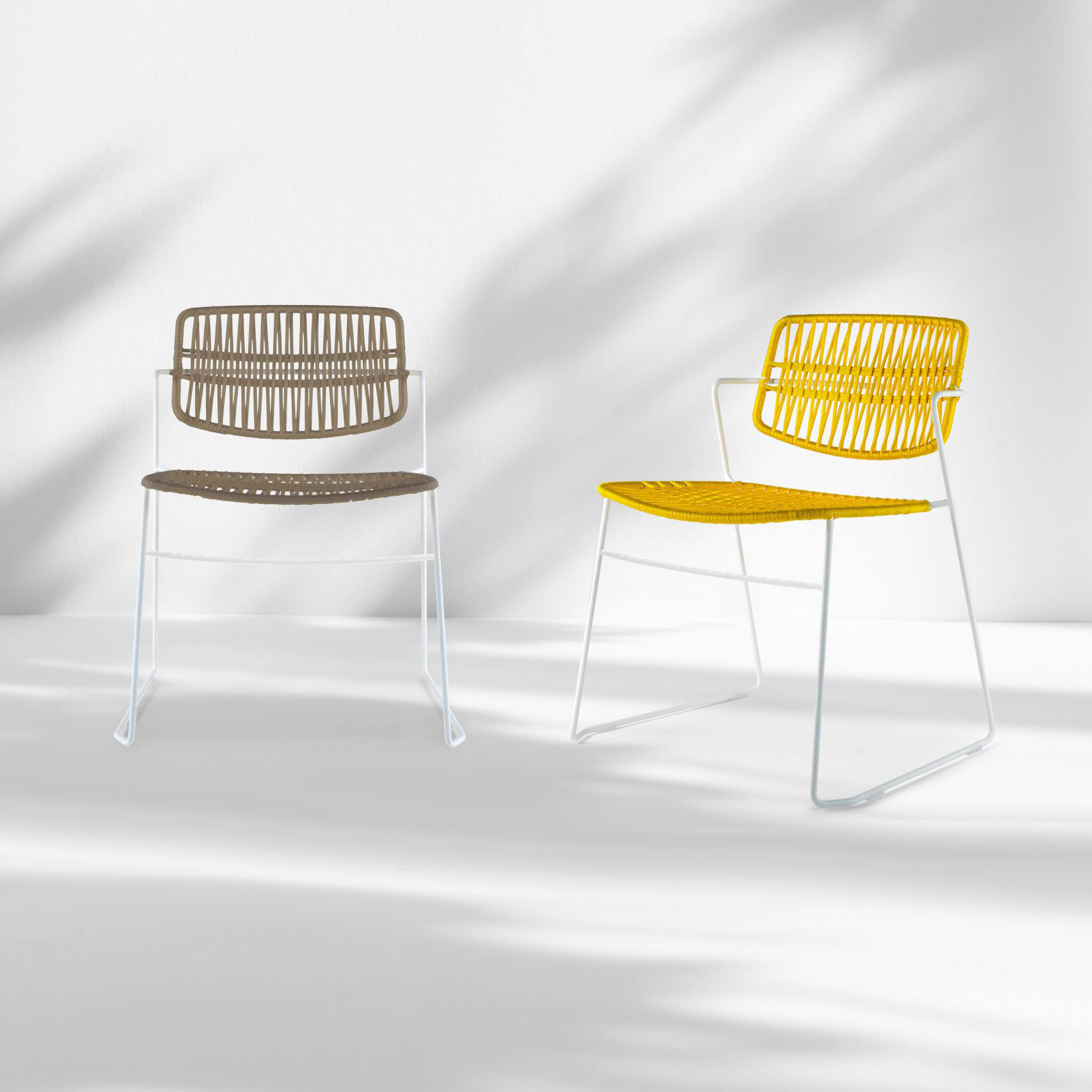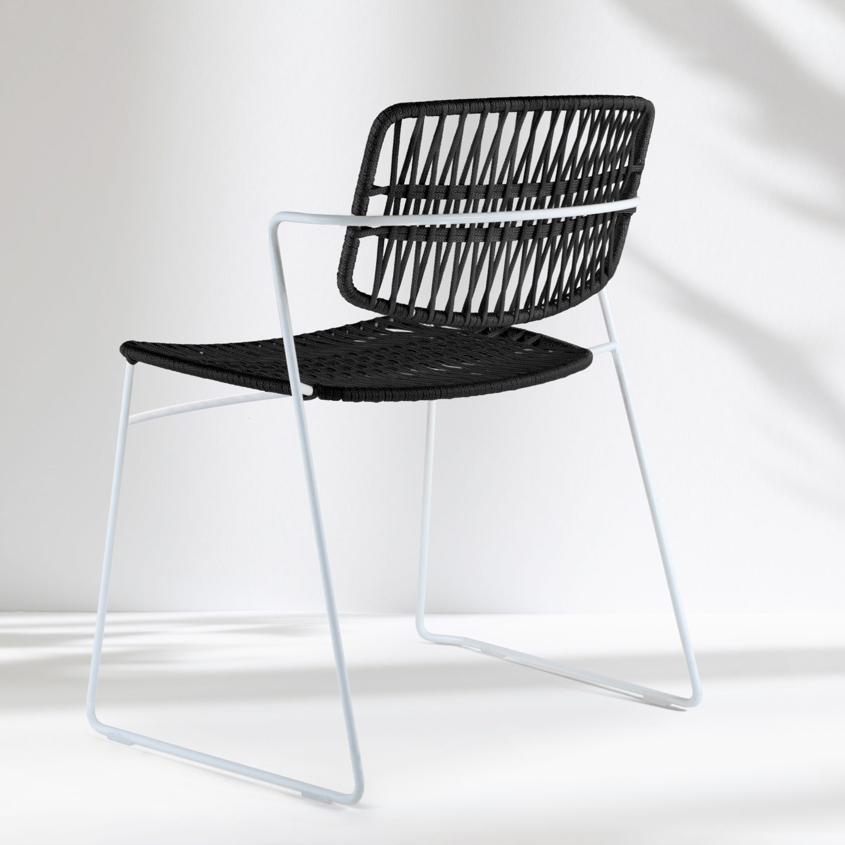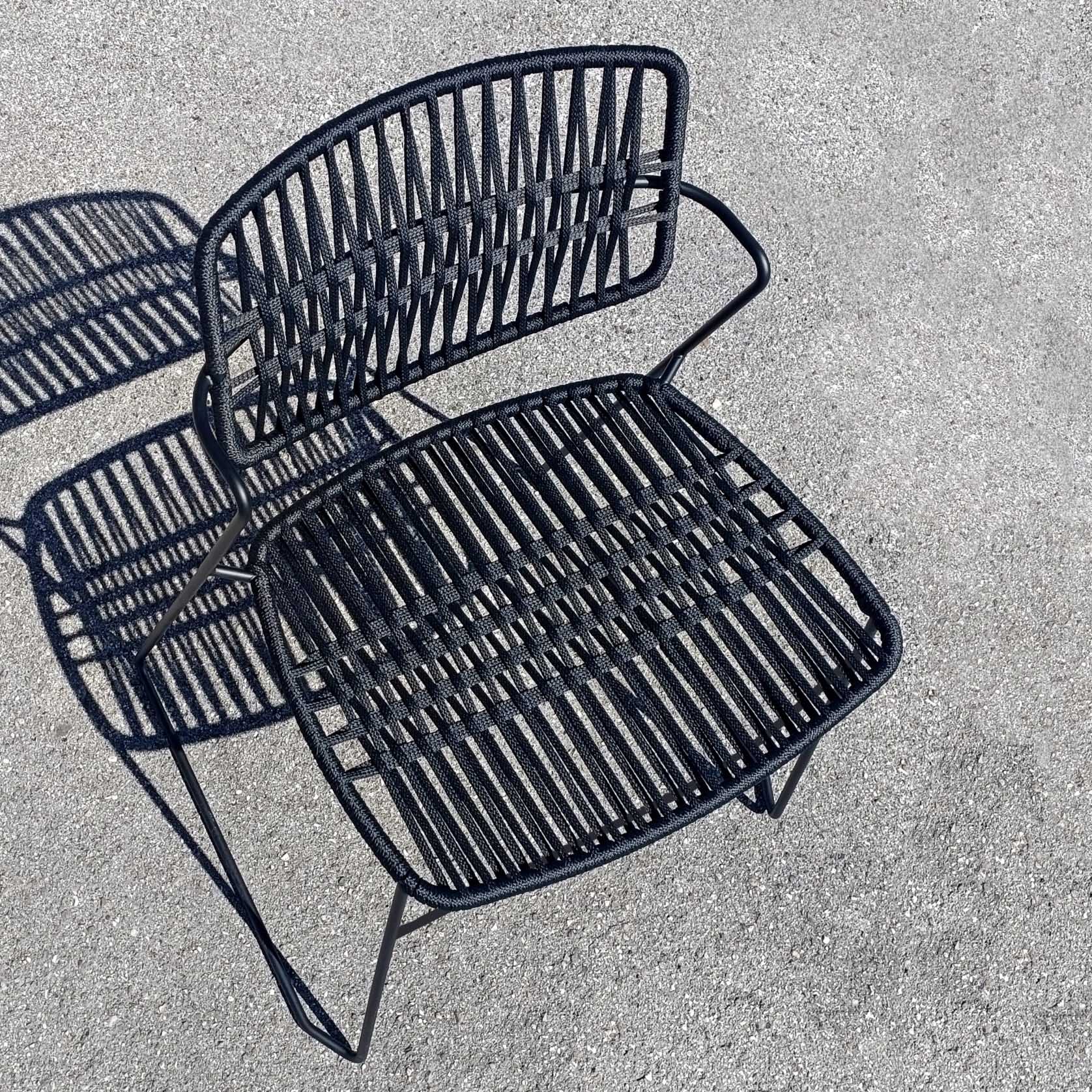 Stackable armchair with lacquered steel rod frame, woven seat and back.
