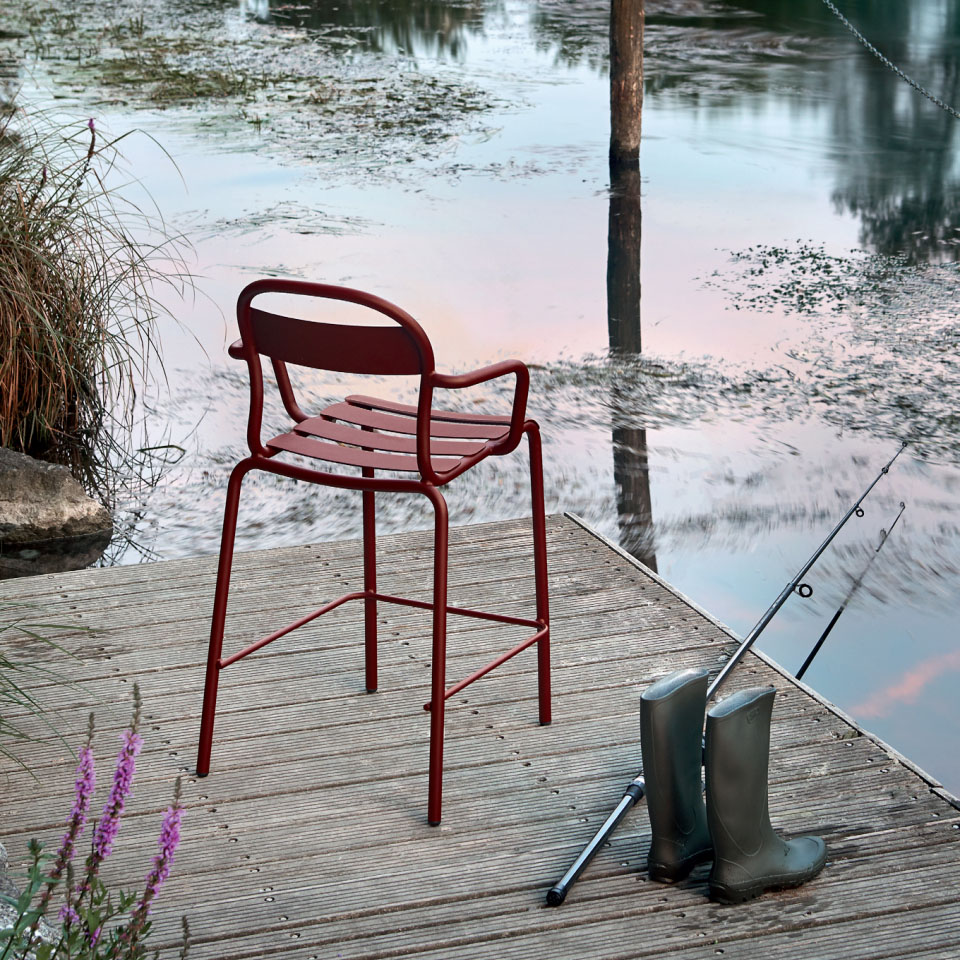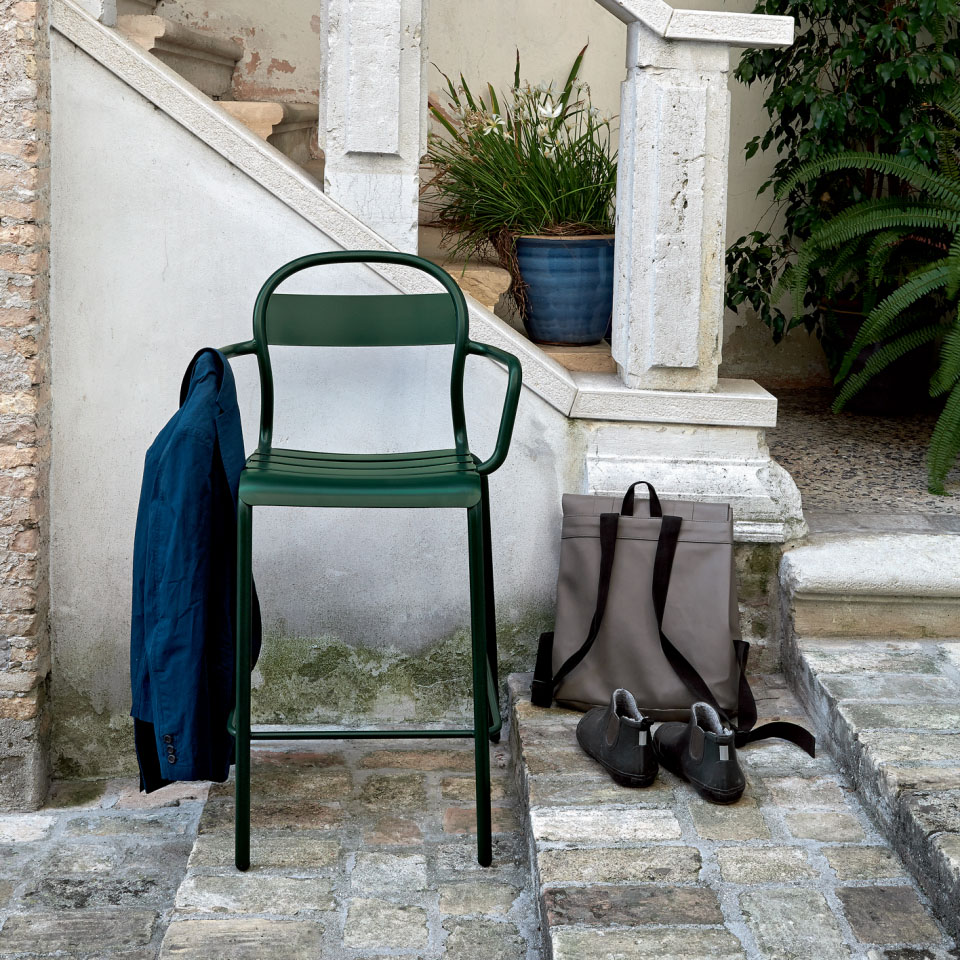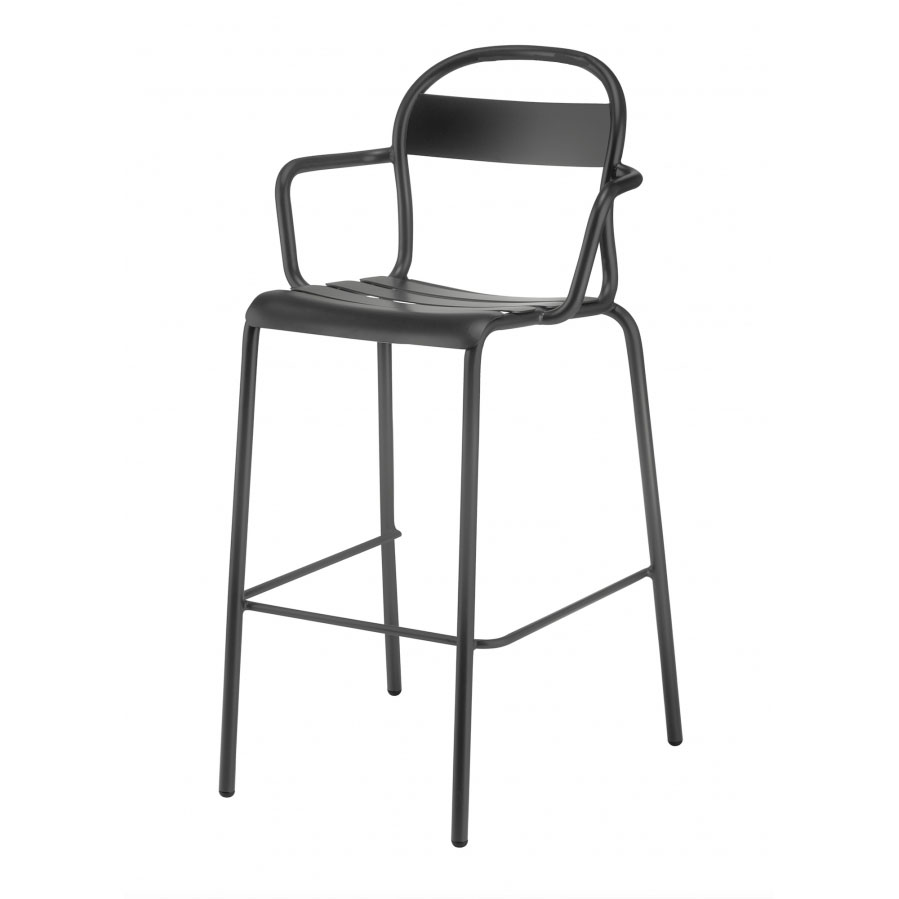 A tall stool with armrests, featuring a light aluminium frame giving it a slim and elegant look. This product is ideal for bars, kitchen islands and bar spaces in general designed for informal situations, such as grabbing an aperitif.