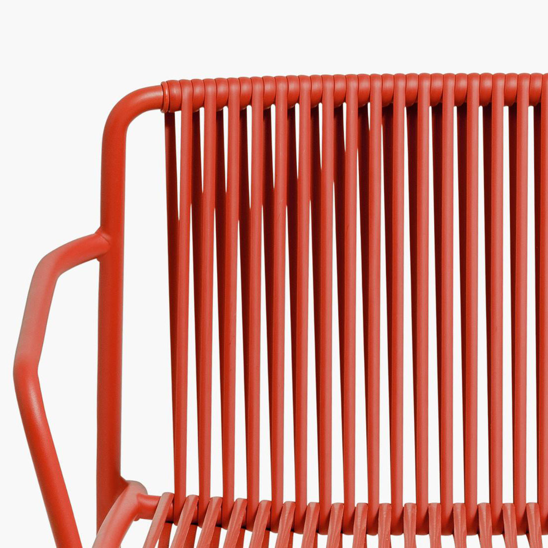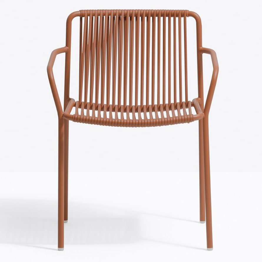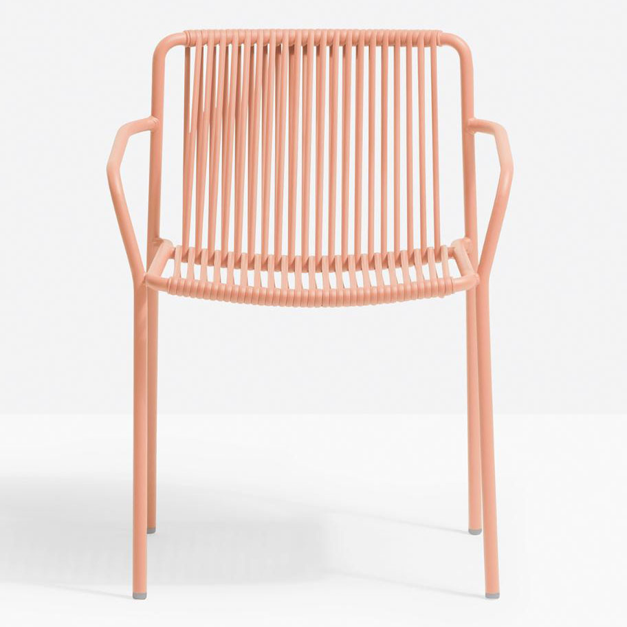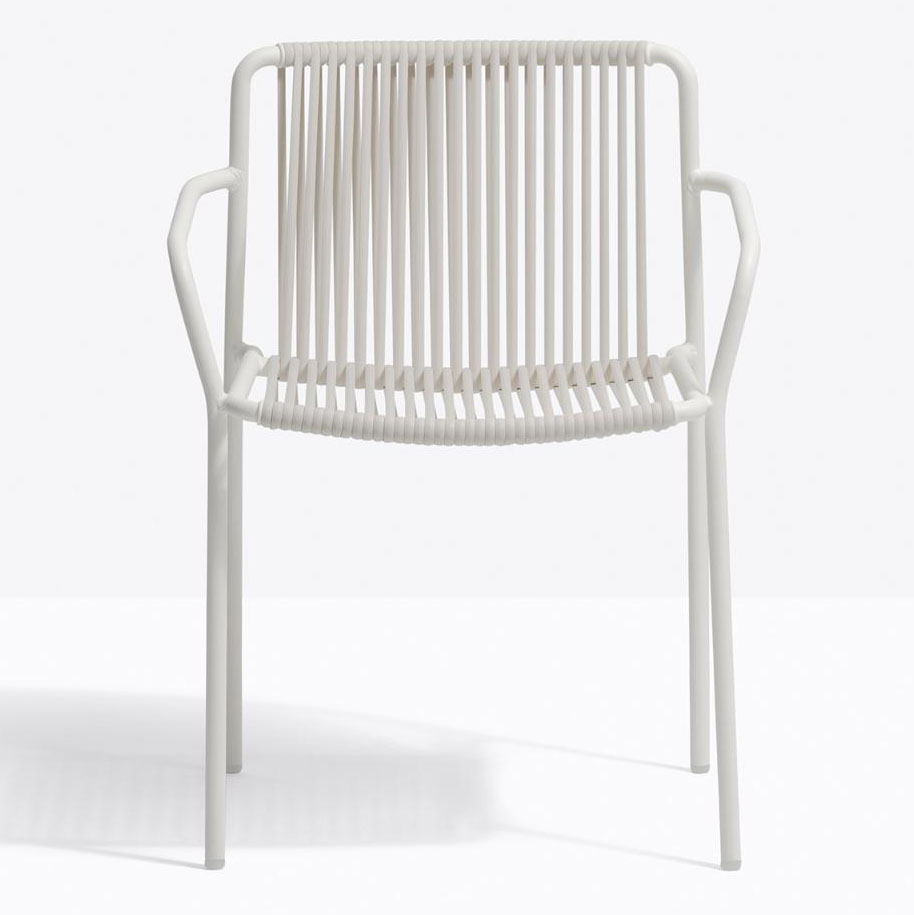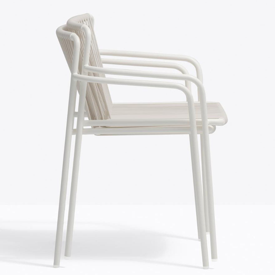 Tribeca takes us back in time with a modern reinterpretation of classic Sixties patio chairs made from steel and woven material. Armchair with Ø20mm tube structure powder coated for outdoor use, backrest and seat in woven extruded PVC with a nylon core. Specifically designed for outdoor use. Stackable.
